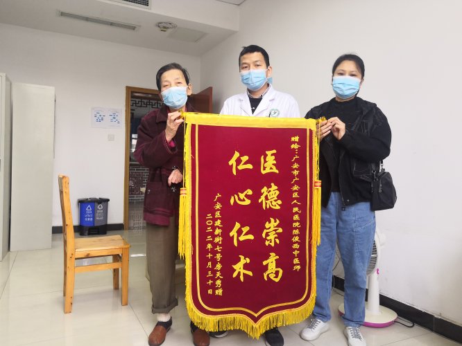一面锦旗传达的不仅仅是感谢,更多的是一份信任,一份认可,同时也是对医护人员的鞭策和鼓励,广安区人民医院中医综合科将以此为动力,时刻谨记全心全意为患者服务的理念,不断提升医疗技术及服务水平,充分发挥传统中医文化的优势,以最好的工作状态和最佳的工作热情来回报广大患者,帮助更多的患者摆脱病痛的折磨。